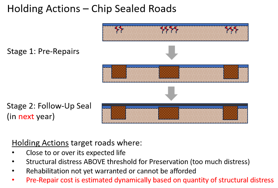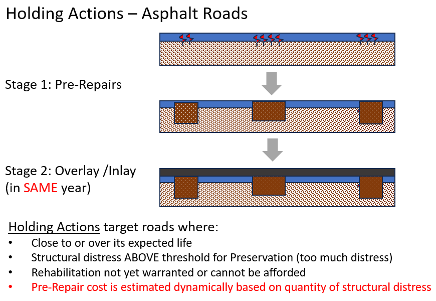 - There is not sufficient funding to perform a rehabilitation, and therefore a Holding Action is placed to mitigate deterioration and keep the pavement at an acceptable level of service.