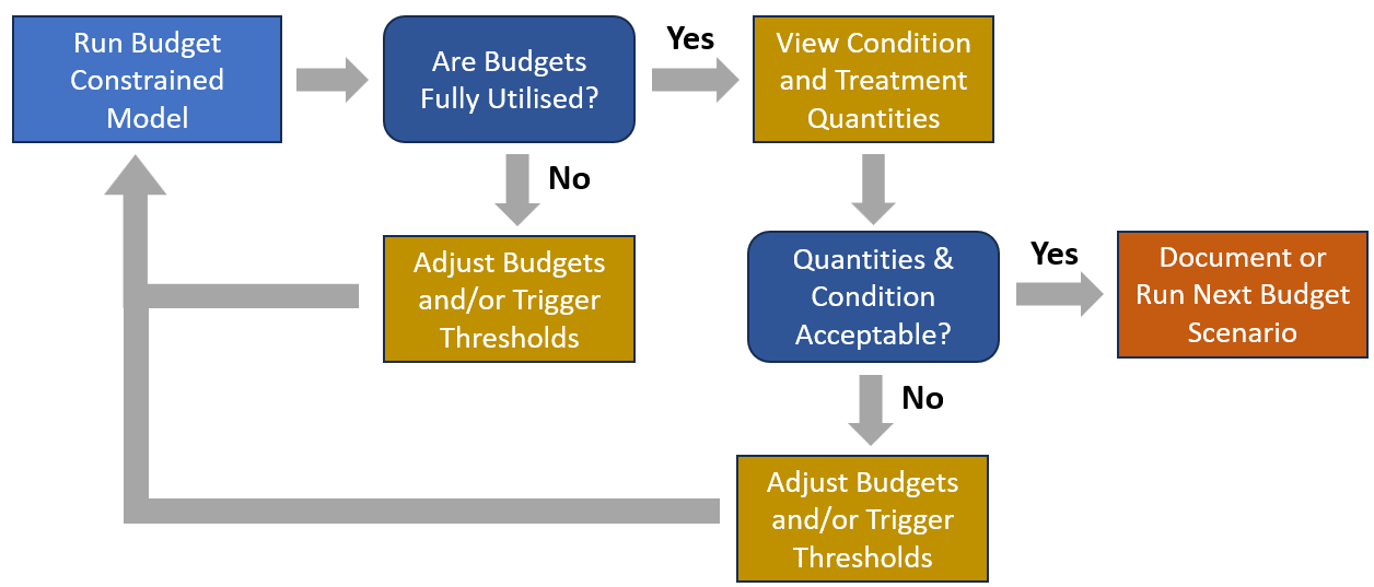 If you finish the above stage, you should be confident that - given enough budget - your model will trigger and apply sufficient treatments to significantly improve network condition. You can now start to explore the more realistic scenarios cases of constrained budget scenarios. Figure 2 shows a suggested workflow for this stage of your modelling project: